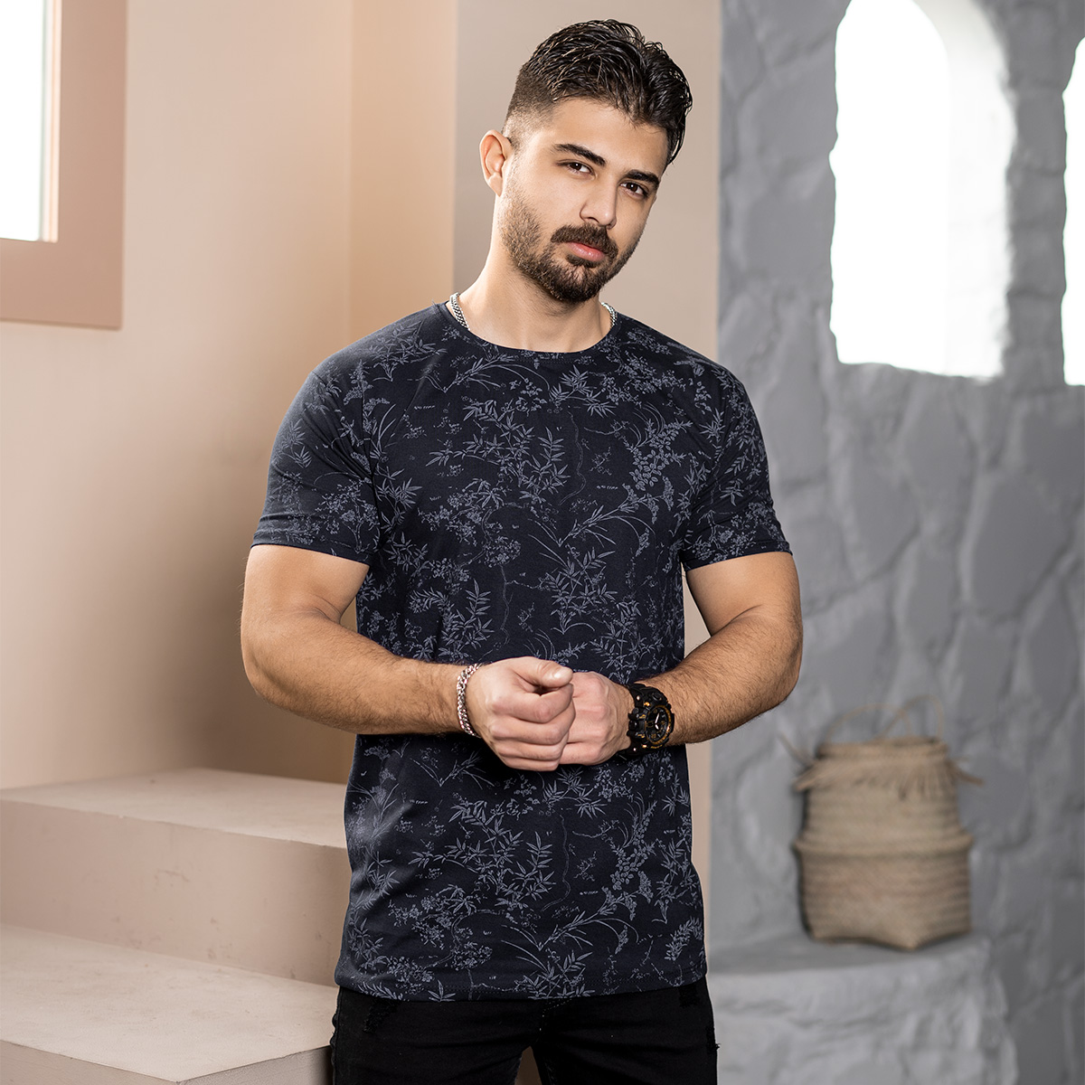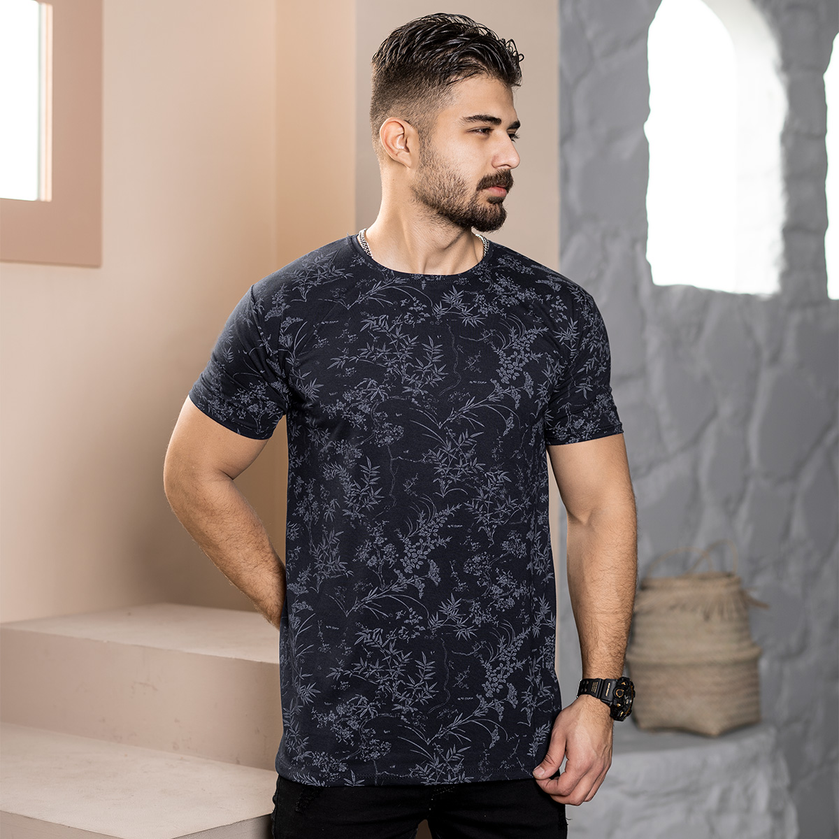 تیشرت مردانه طرح برگ مشکی مدل Jeasen