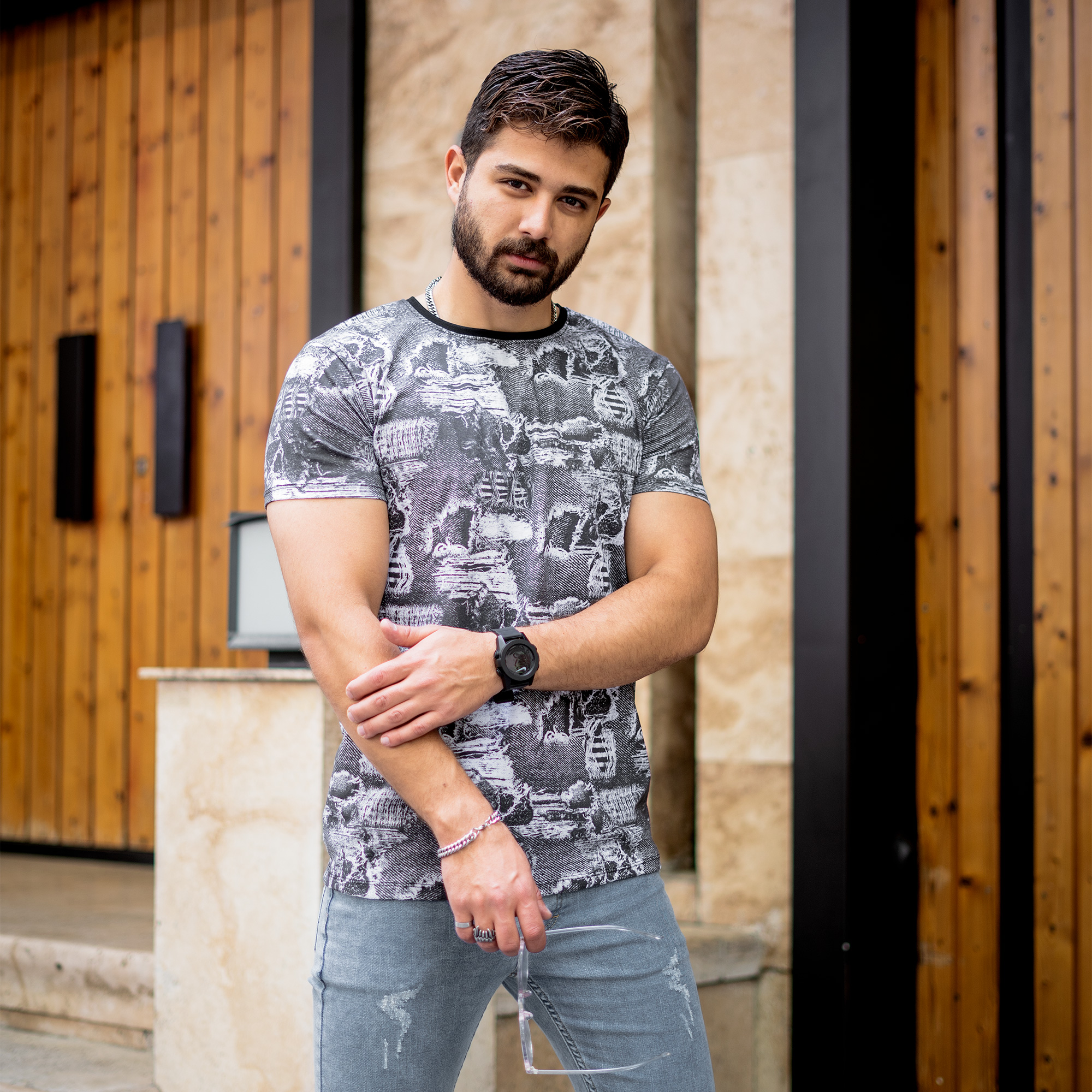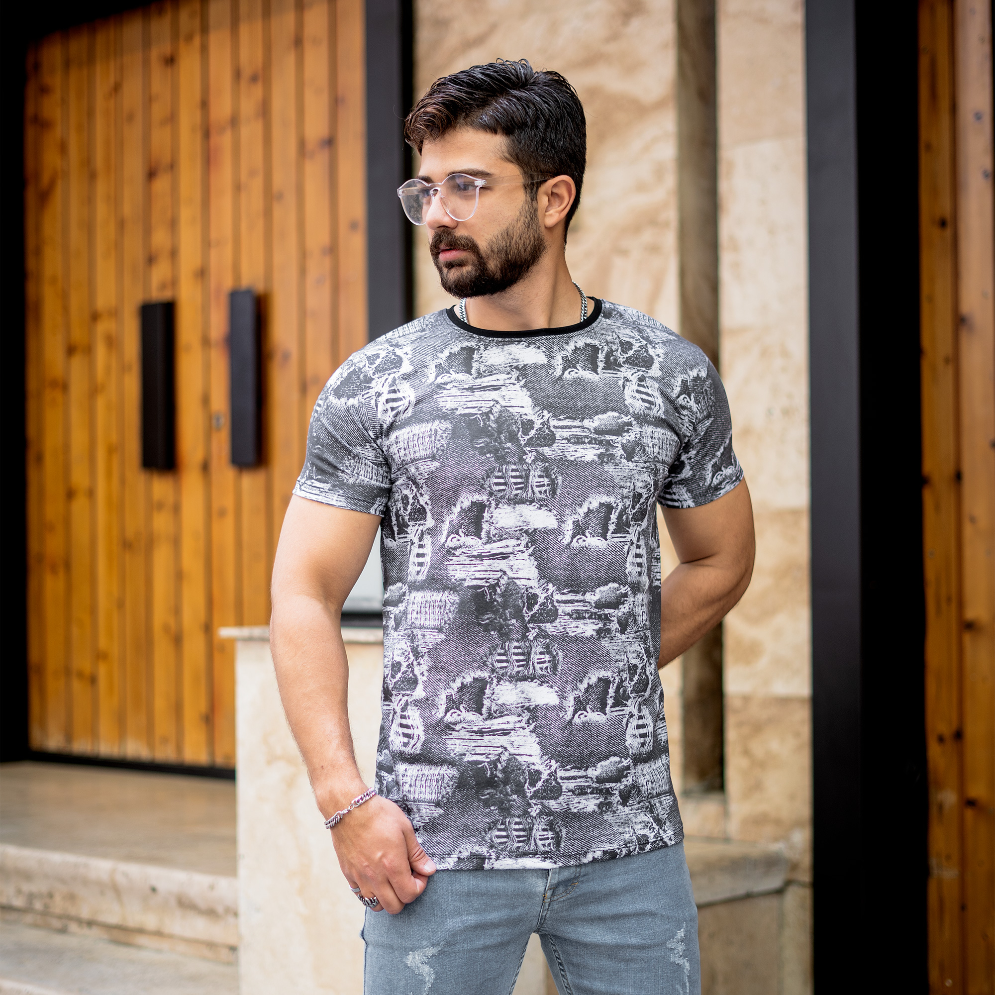 تیشرت طرحدار طوسی مردانه مدل TOTIX